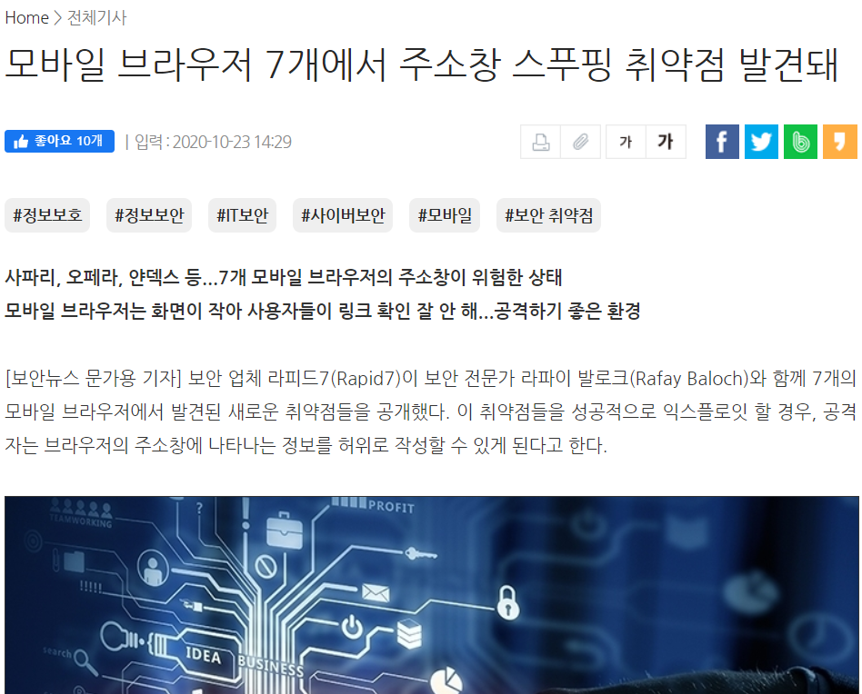 7가지 모바일 브라우저에서 URL 속이는 취약점 발견됬는데, 모바일 사용자들은 작은 화면때문에, URL 주소를 잘 확인하지 않는다. 그렇기 때문에, 공격자 입장에서는 좀 더 편리하게 공격할 수 있는데, 공격자들이 이를 통해 주소창 정보를 조작할 수 있고, 모바일 사용자는 더 쉽게 속게 되는데, 현재 이 문제가 해결된 브라우저는 사파리와 오페라 뿐이다. 나머지 마이너 브라우저들은 위험에 노출되어 있다. 빠른 시일 내에 조치되어야 할 것으로 보인다.