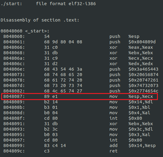 mov ecx, esp 부분에서 ecx 에 esp 의 주소를 저장하는데,