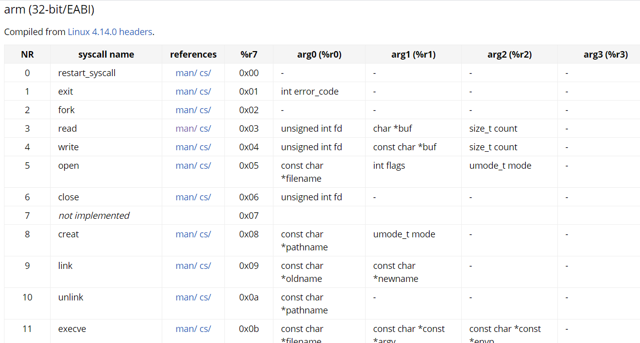 정리하자면, 32bit Linux OS 를 사용하고, ARM 을 사용했으므로 x86 Arm syscall table 을 보면 syscall 3, 4 가 뭔지 알 수 있을 것이다.
