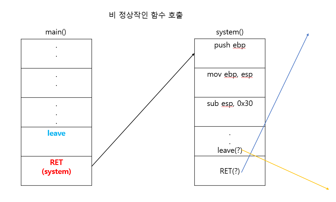 비 정상적인 함수 호출 -> call 명령어 사용 X (RET 에 바로 함수 주소를 넣어버림)