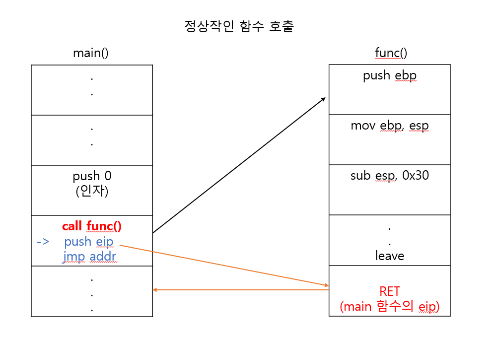 정상적인 함수호출 -> call 명령어(push eip, jmp addr) 사용