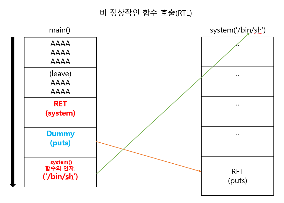 꽤 많은 사람들이 RTL을 설명할 때 왜 Dummy 값을 넣어주어야 하는지 모르는 사람이 꽤 있는거 같아서 글을 써보고자 한다. (Dummy 에 들어가는 곳은 RET 에 넣어준 함수가 종료된 후 호출하는 주소 라는 정도만 알고있는 것 같다.)