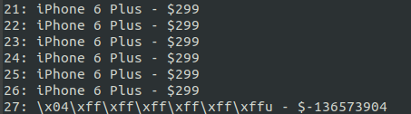 printf("%d: iPhone 6 - $%d\n", 1, 199);
