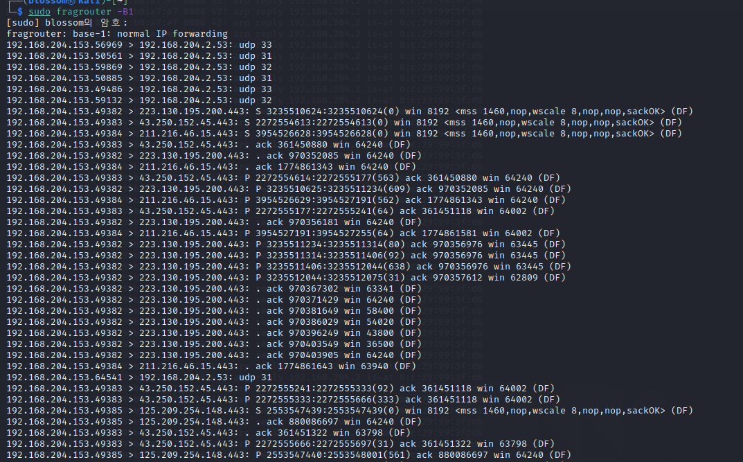 여기서 터미널을 하나 새로 열어 fragrouter -B1 을 입력해 보자.