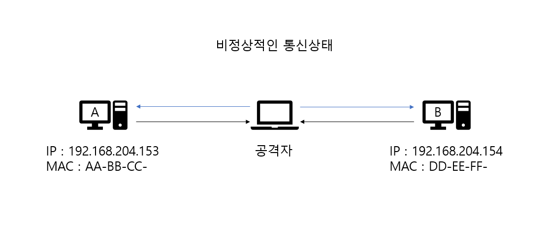 A와 B사이에 공격자가 들어갔다.