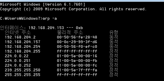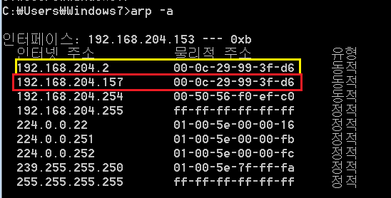 그리고 피해자 PC 에서 arp -a 명령어를 입력해 ARP 테이블을 확인해 보자.