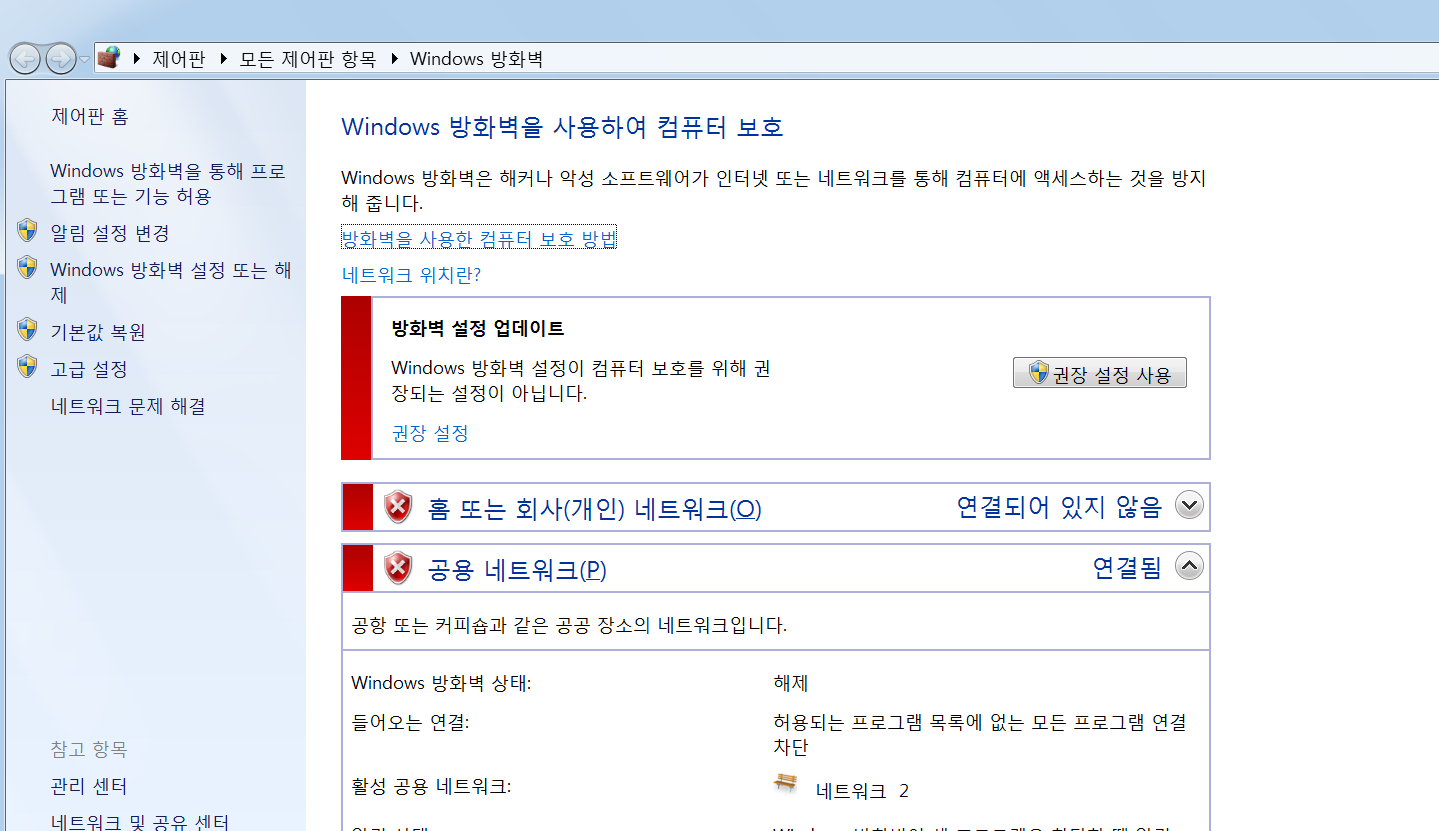 만약 방화벽을 해제하지 않으면